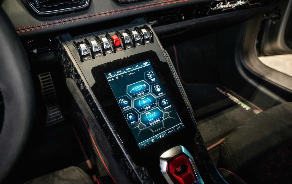Nổi bật giữa trung tâm là màn hình cảm ứng 8,4 inch có tên Lamborghini Dinamica Veicolo Intergrata, tùy chỉnh hệ thống giải trí và các chức năng của xe. Màn hình cũng cho phép kết nối Apple CarPlay và Android Auto. Phía trên là dãy nút gồm đóng/mở cửa sổ, tắt ESC, nâng hạ gầm, đèn cảnh báo và bật cảnh báo điểm mù.